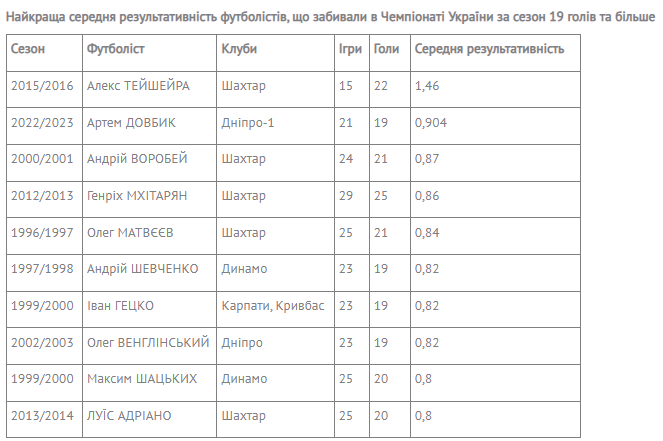 Загалом серед футболістів, які забивали за сезон в ЧУ як мінімум 19 м’ячів, більш високу середню результативність має тільки Алекс Тейшейра. Бразильський півзахисник (!) «Шахтаря» восени 2015 року влаштував справжню феєрію — 22 голи за 15 матчів (в середньому — 1,46 гола за гру!). Але в зимове міжсезоння 2016-го гірники влаштували його трансфер в китайську Суперлігу.