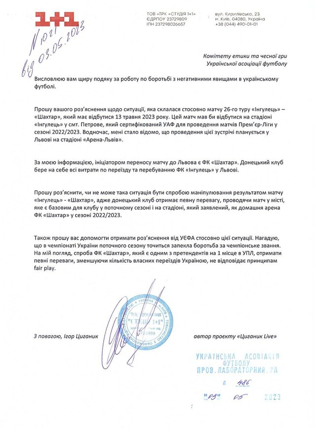 "Прошу вашого роз'яснення щодо ситуації, яка склалась стосовно матчу 26-го туру Інгулець – Шахтар, який має відбутись 13 травня 2023 року. Цей матч мав відбутись на стадіоні "Інгулець" у смт. Петрове, який сертифікований УАФ для проведення матчів Прем'єр-ліги у сезоні 2022/23. Водночас, мені стало відомо, що проведення цієї зустрічі планується у Львові на стадіоні Арена Львів.