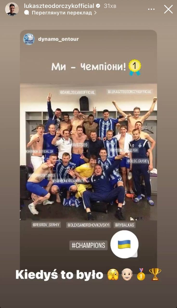 Колишній нападник "Динамо" Лукаш Теодорчик у своєму Instagram зробив репост ностальгічного фото з періоду виступів за киян, коли вони стали чемпіонами.