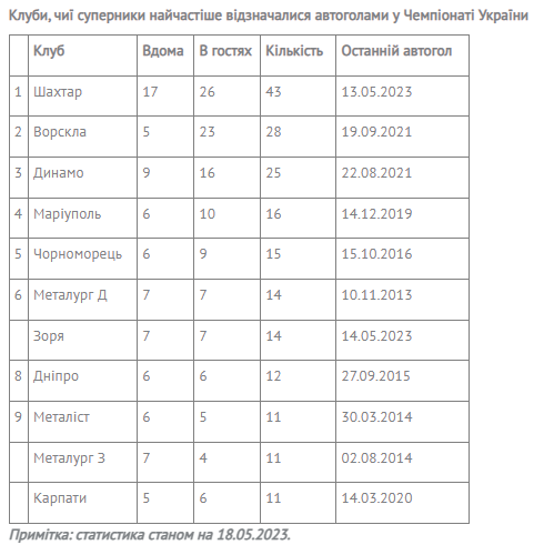 У матчах із «Шахтарем» у свої ворота забивали голи представники 22-х клубів, а найчастіше з «Говерли», «Маріуполя» — по 5 разів, «Динамо» — 4, «Волині», донецького «Металурга» та «Карпат» — по 3.