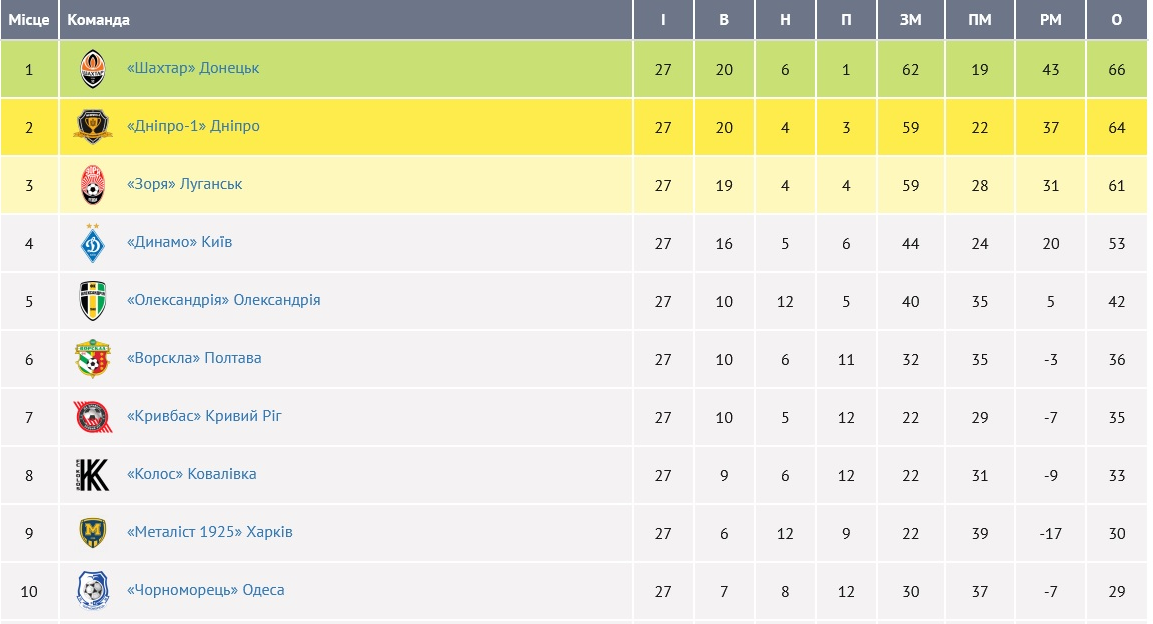 Турнірна таблиця Прем'єр-ліги після 27-го туру