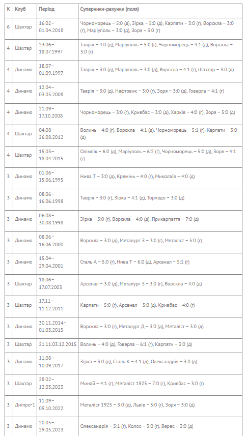 Найдовші серії перемог з великим рахунком одного клубу в Чемпіонатах України (1992 – 04.06.2023)