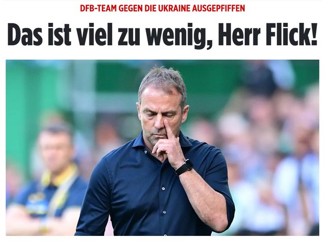 "Цього дуже мало, містере Флік! Що відбувається з нашою збірною? З Україною команда знову показала жахливу гру. За рік до чемпіонату Європи не видно просвітку. У важливому тисячному матчі були дуже погані відрізки.