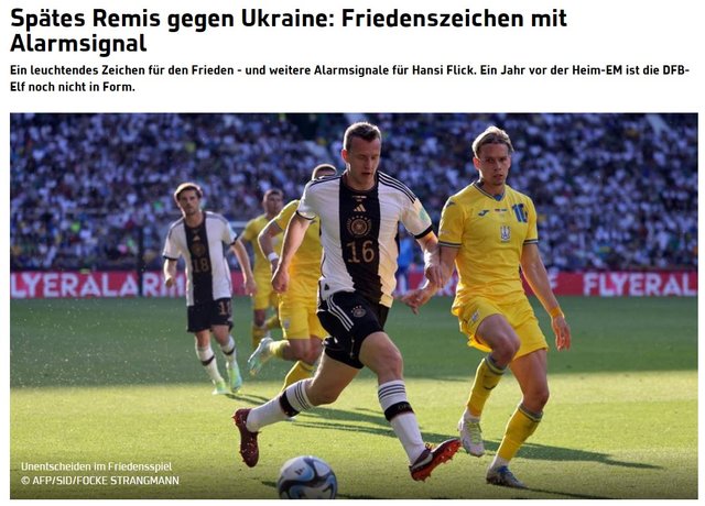 "У матчі проти України вкотре виплили проблеми команди Гансі Фліка. Не вистачило найпростішого: фізичної підготовки, швидкості руху м'яча, концентрації. Добре, що хоча б показали бойовий дух. Замість довгоочікуваного свята фани на Везерштадіоні пережили вечір протверезіння. У розпачі трибуни освистали збірну.