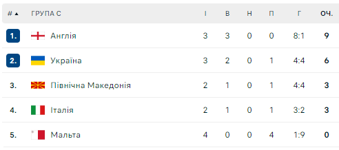 У збірної України – 6 очок та друге місце, а лідирує Англія з 9 балами.
