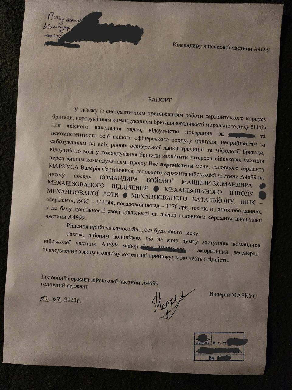 Український військовий та блогер Валерій Маркус, відомий своїми публікаціями у YouTube та Facebook, що служить у 47-й бригаді ЗСУ, написав рапорт з проханням перевести його на найнижчу посаду та висловивши претензії до командування.
