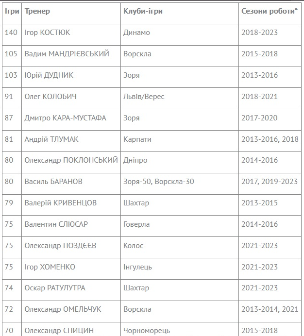 Принагідно серед діючих тренерів юнацьких команд виділимо Василя Баранова («Ворскла»), який на одну гру випередив Валерія Кривенцова («Шахтар»), Олександра Поздєєва («Колос») та Ігоря Хоменка («Інгулець»), які наздогнали Валентина Слюсара («Говерла»).