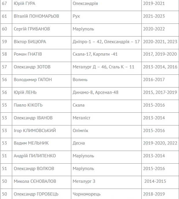 Очолили клубні гвардійські списки юнацьких тренерів Віталій Косовський («Кривбас»), Сергій Мізін («Минай») та Олег Шандрук («Верес»).