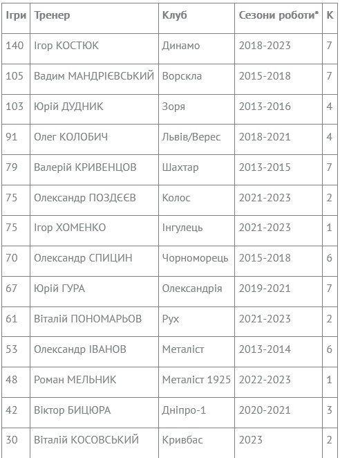 Примітка: *вказані роками їх завершення, К – кількість усіх тренерів клубу.