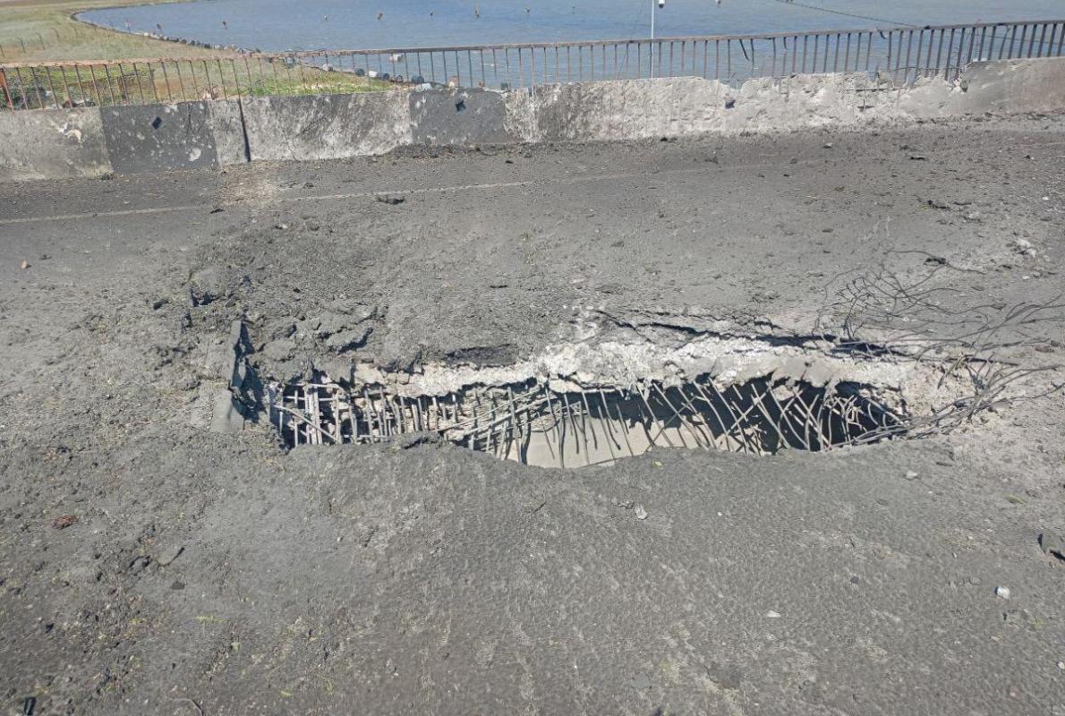 У мережі вже з'явилися відео наслідків прильотів по мосту. На дорожньому покритті утворилася величезна вирва.