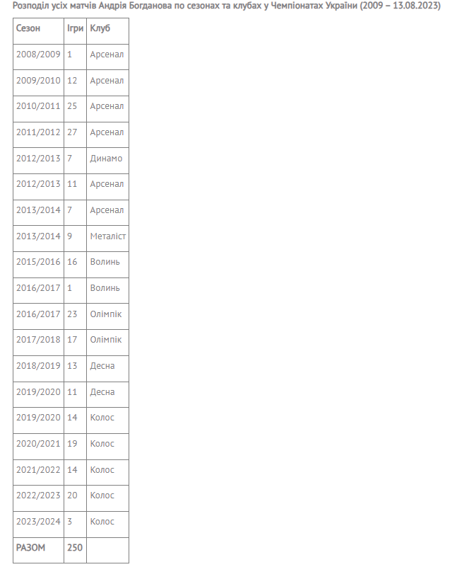 Андрій виходив на поле в складі 7-ми клубів УПЛ: «Арсеналу» – 83 гри, «Динамо» – 7, «Металіста» – 9, «Волині» – 17, «Олімпіка» – 40, «Десни»- 24 та «Колосу» – 70.