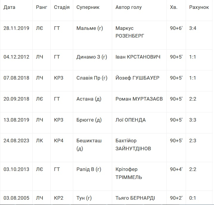 Найпізніші вирішальні голи, пропущені «Динамо» в єврокубках (в основний час матчів)