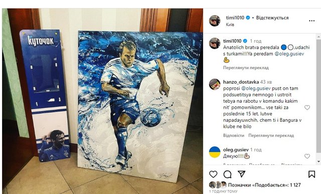 Уболівальники Динамо передали через Мілевського подарунок для Олега Гусєва. Це картина із зображенням легенди "біло-синіх" у ігровій формі київського клубу.
