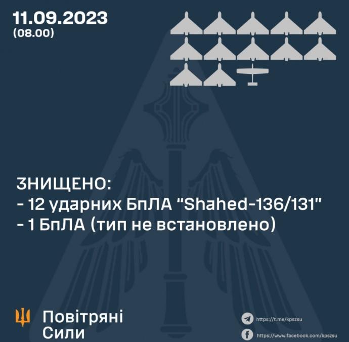 В результаті бойової роботи силами та засобами Повітряних сил, у взаємодії із протиповітряною обороною інших складових Сил оборони, знищено 12 "Shahed-136/131" у межах Запорізької, Дніпропетровської та Миколаївської областей, а також один БпЛА невстановленого типу".