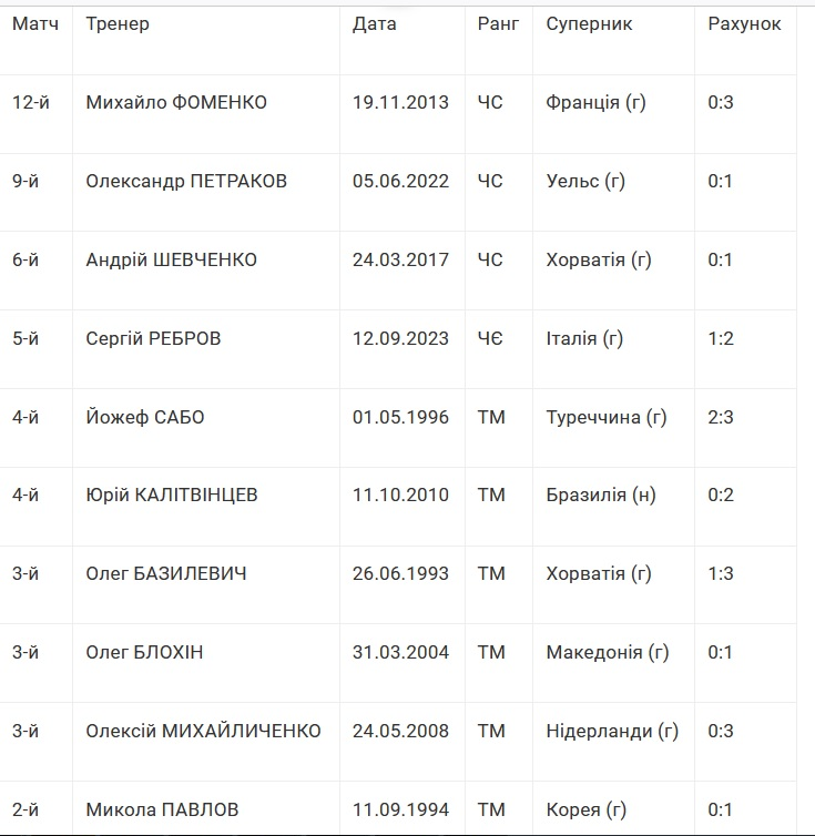Серед наставників українців більш тривалі стартові безпрограшні серії мали лише три тренери – Михайло Фоменко, Олександр Петраков та Андрій Шевченко.