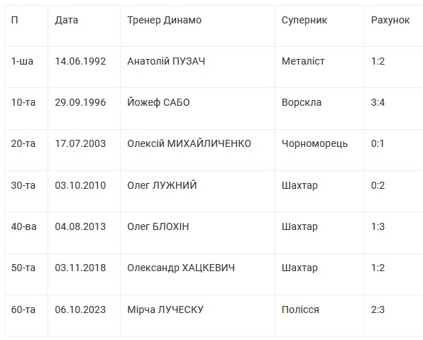 12 фіаско в гостях «Динамо» зазнало за Олексія Михайличенка, 8 – за Олега Блохіна, 7 – за Юрія Сьоміна, 6 – за Йожефа Сабо, 5 – за Валерія Лобановського, по 4 – за Валерія Газзаєва, Мірчі Луческу, Сергія Реброва та Олександра Хацкевича, 3 - за Анатолія Пузача, 2 – за Михайла Фоменка та 1 – за Олега Лужного.