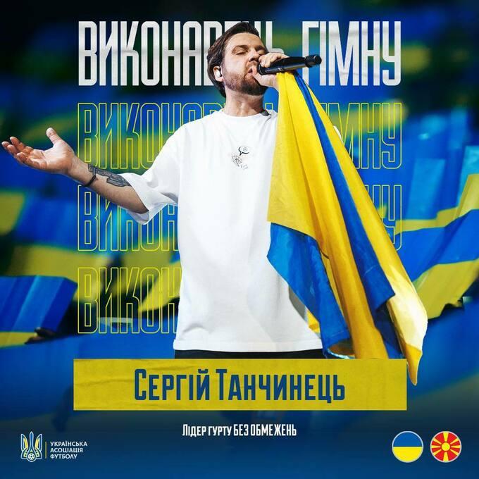 Фронтмен популярного українського гурту «БЕЗ ОБМЕЖЕНЬ» Сергій Танчинець заспіває державний гімн напередодні старту поєдинку проти збірної Північної Македонії.