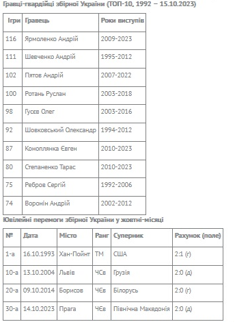 Микола Матвієнко відіграв свій 60-й матч за збірну, а Ілля Забарний – 30-й. Перемога у Празі стала для «синьо-жовтих» ювілейною, 30-ю, здобутою саме у жовтні-місяці у всіх турнірах.