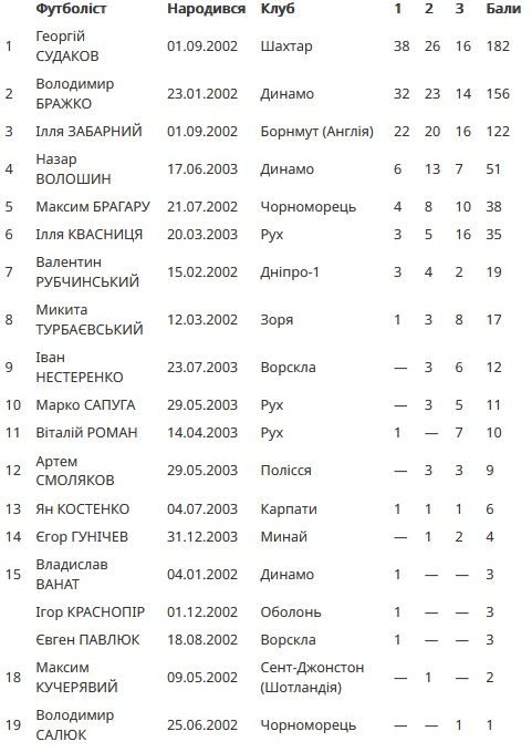 (Динамо), Володимир Бражко (Зоря) та Ілля Забарний (Борнмут).