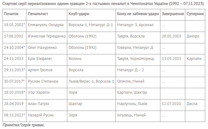Тим самим він став уже 9-м співавтором антирекорду пенальтистів, чиї стартові виїзні серії нереалізованих ударів з «позначок» увібрали в себе два поспіль пенальті.