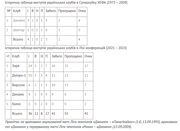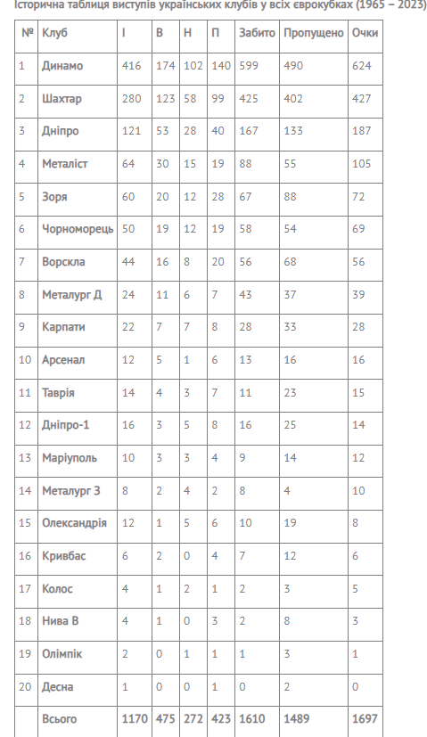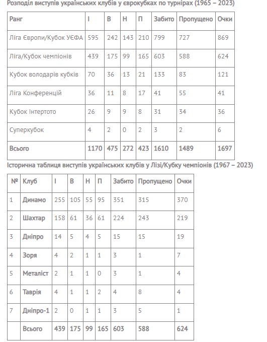 Починаючи з 1965 року, загалом уже 20 українських клубів провели у 6-ти єврокубкових турнірах 1170 матчів: 475 перемог, 272 нічиї, 423 поразки, різниця м’ячів 1610-1489