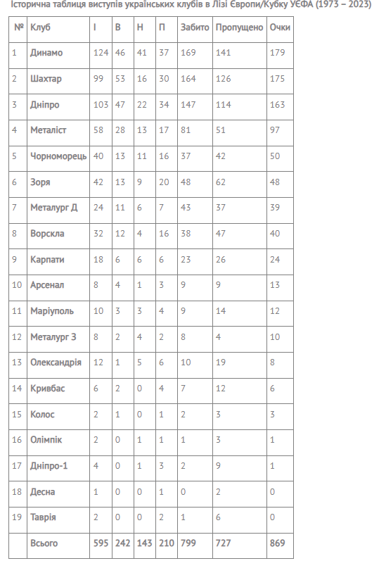 "Динамо" - на першому місці в історичній таблиці виступів українських клубів у всіх єврокубках