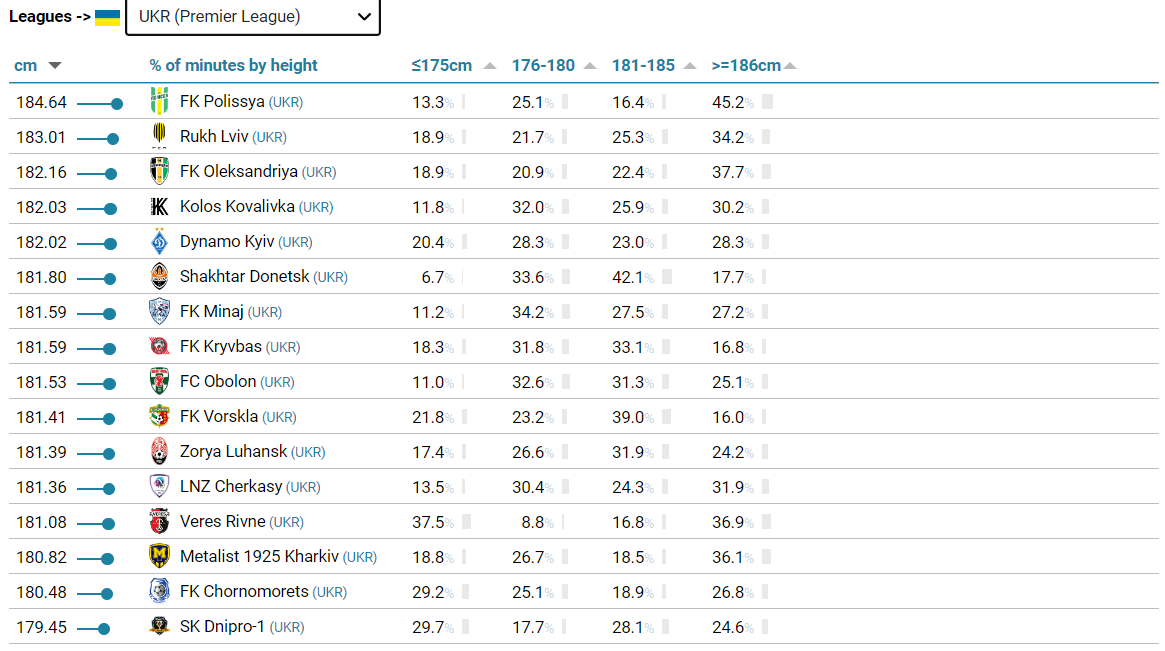 Найнижча команда – «Дніпро-1»: тут середній зріст задіяних на полі виконавців 179,45 см.