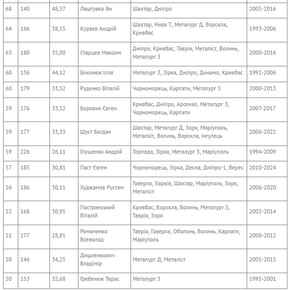 Воротарі з найбільшою кількістю «сухих» матчів у Чемпіонатах України (1992 – 01.01.2024)