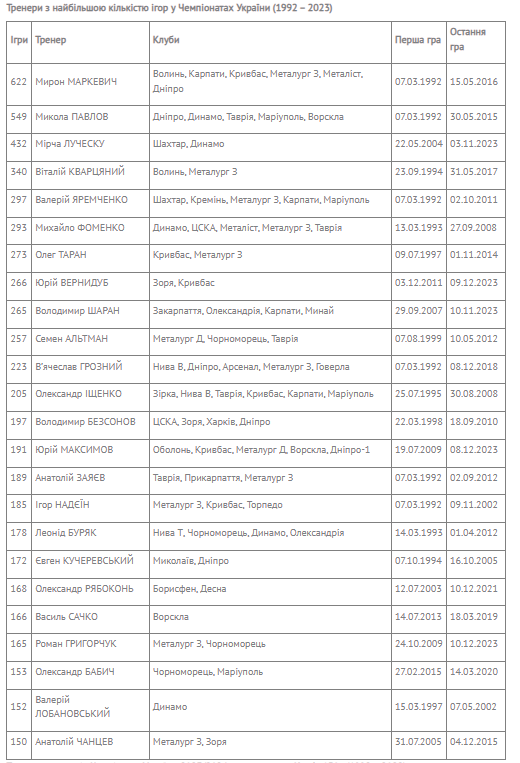 Серед учасників VBET Ліги найбільше ігор біля керма різних команд провів тепер уже колишній головний тренер «Динамо» Мірча Луческу – 432. За цим показником румунський фахівець в історичному списку усіх тренерів посідає почесне 3-є місце.