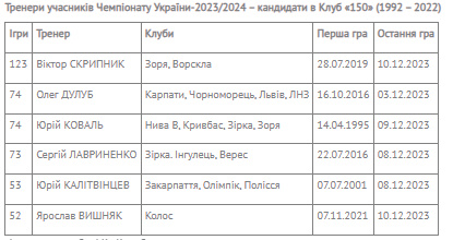 У ході першої частини нинішнього Чемпіонату поповнили реєстр своїх тренерських матчів в УПЛ Юрій Вернидуб та Володимир Шаран. При цьому наставник «Кривбасу» в заключному матчі 2023 року потіснив тепер уже колишнього керманича «Минаю» Шарана і вийшов на восьме місце в списку гвардійців українських Чемпіонатів.