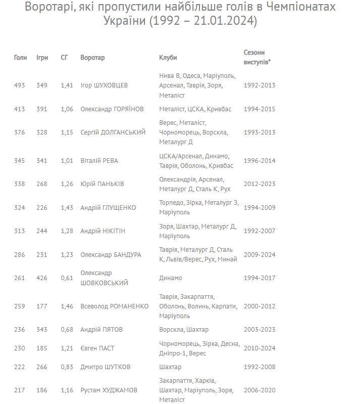 За всю історію 33-х чемпіонатів України виступало 313 воротарів з 48-ми клубів. Нині мова піде про воротарів, які найбільше пропустили голів. Понад десять років очолюює цей «пропускний» список Ігор Шуховцев, у ворота якого влітало 493 голи у 349-ти матчах у складі семи клубів, або в середньому 1,41 м’яч за гру.