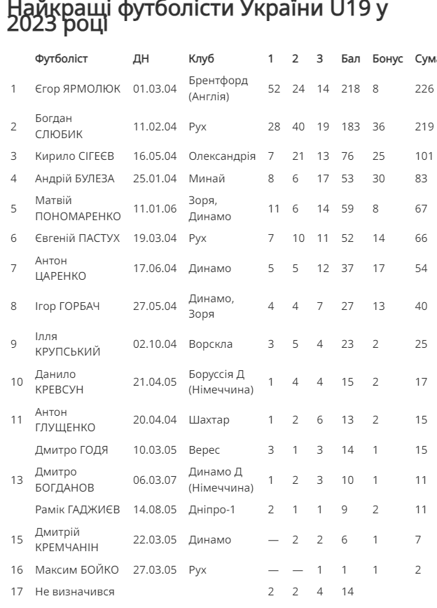 Серед цієї компанії троє гравців представляли закордонні клуби, і один з них — Єгор Ярмолюк — у підсумку й посів першу сходинку річного рейтингу-2023. Він насправді заслуговує на повагу, оскільки почав грати за Брентфорд в англійській Прем’єр-лізі, до кінця 2023-го мав в активі 12 матчів за першу команду. Окрім того, став футболістом основної обойми молодіжної збірної на старті відбору Євро-2025 (U21) — 6 матчів.