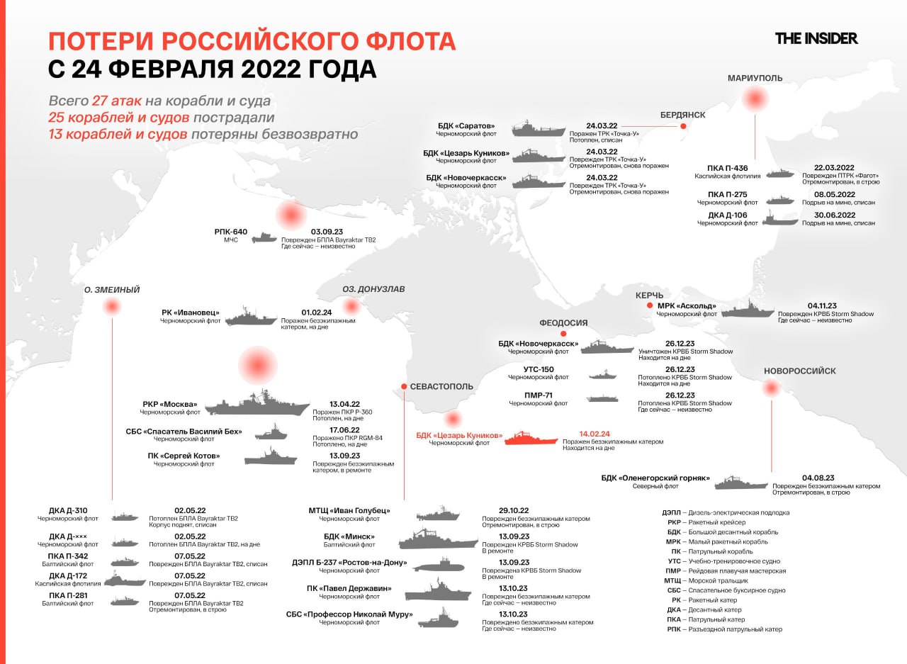 Усього з початку повномасштабного вторгнення постраждали 25 кораблів ВМФ Росії та МНС (БДК "Новочеркаськ" та "Цезар Куніков" двічі потрапляли під удар ). 13 кораблів знищено повністю, серед них — крейсер "Москва" та ракетний катер "Івановець", повідомляє The Insider.