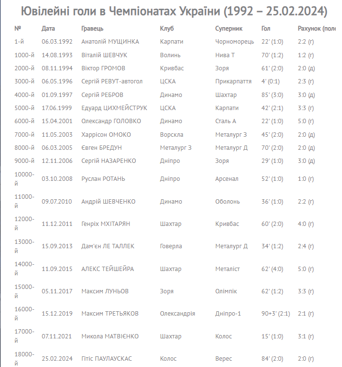 Перший тур весняної частини VBET Ліги приніс історичну подію в українському футболі. У матчі "Верес" - "Колос" литовський новачок ковалівського клубу Гітіс Паулаускас став автором ювілейного, 18 000 (!), голу в Чемпіонатах України.