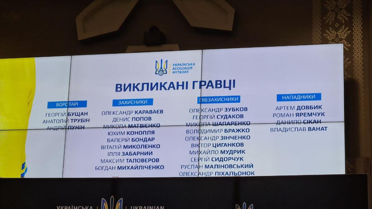 Резервний список: Дмитро Різник, Єгор Назаріна (обидва – «Шахтар»), Олександр Тимчик («Динамо»), Олексій Гуцуляк («Дніпро-1»).
