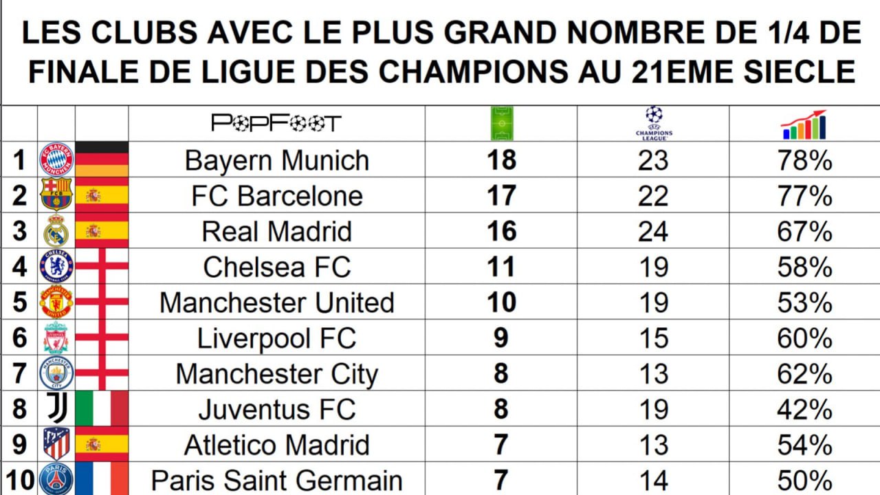 Клуби з найбільшою кількістю виступів у чвертьфіналі Ліги чемпіонів у 21-му столітті: "Баварія" на першому місці