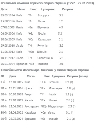 Примітка: ЧСв - відбірковий турнір чемпіонату світу, ЧЄв - відбірковий турнір чемпіонату Європи, ЧЄф – фінальний турнір чемпіонату Європи, ТМ – товариський матч.