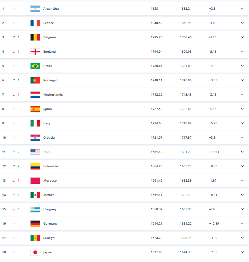 Лідером рейтингу залишається національна команда Аргентини.