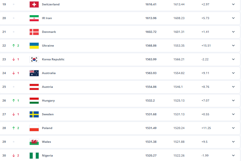 ФІФА оновила рейтинг національних збірних, в якому Україна перебуває на 22-му місці.