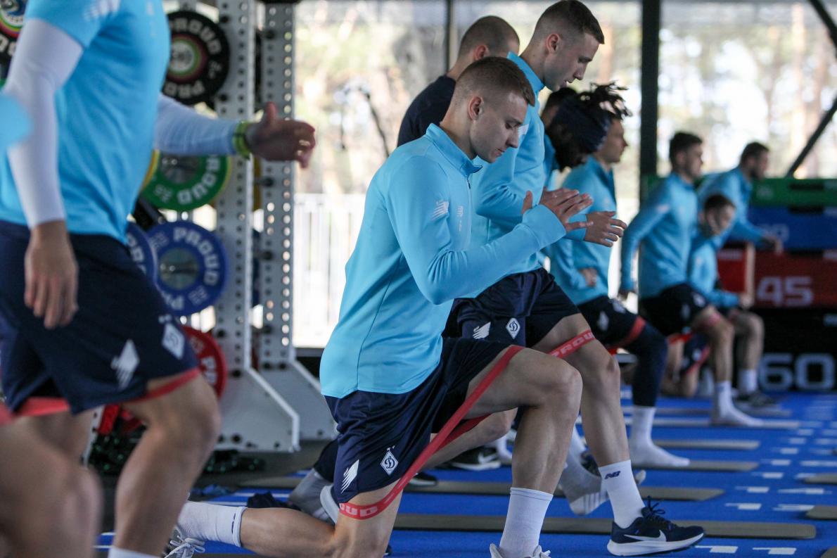 «Динамо» на своїй клубній базі після гри чемпіонату з «Поліссям» тренувалися у спортзалі. Легка фітнес-розминка та силові вправи для відновлення.