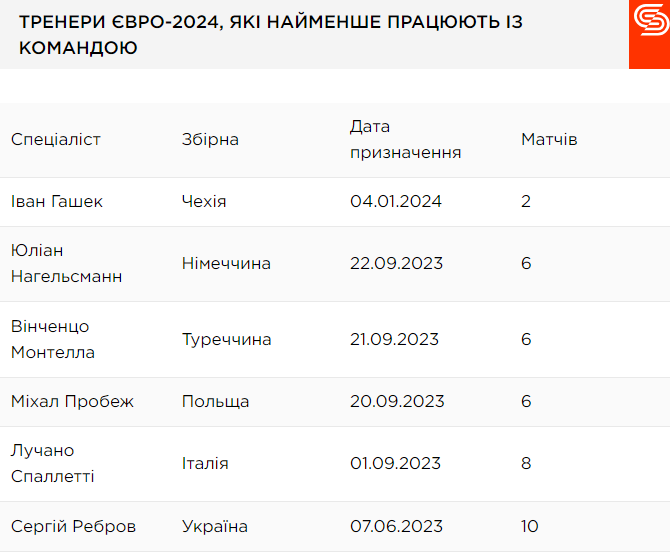 Якщо ж говорити про кількість часу роботи з командою, то менше за Реброва збірні, які зіграють на Євро-2024, очолюють п’ять фахівців. Найменше – Іван Гашек, який очолив збірну Чехії у січні цього року. Чотири збірні – Німеччини, Туреччини, Польщі та Італії – змінили наставників у вересні минулого року.