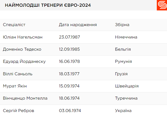 14 червня у Німеччині стартує чемпіонат Європи з футболу. На Євро-2024 зіграють 24 збірні, розділені на шість груп. Національна команда України потрапила до квартету Е, де зустрінеться зі збірними Бельгії, Словаччини та Румунії. Примітно, що у групі синьо-жовтих опинилися три з семи наймолодших наставників Євро-2024. Серед них – і наставник збірної України Сергій Ребров.