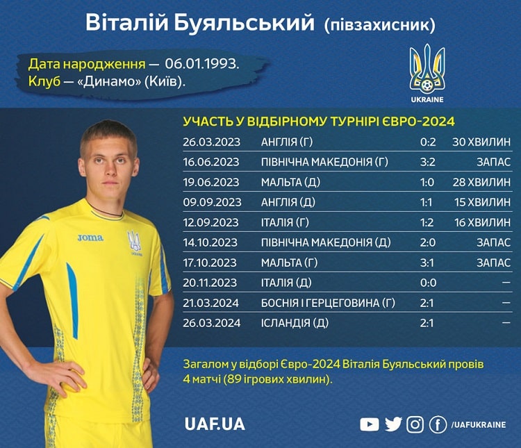 У відборі Євро-2024 півзахисник київського «Динамо» Віталій Буяльський провів чотири матчі.
