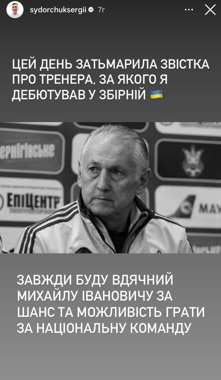 "Цей день затьмарила звістка про тренера, за якого я дебютував у збірній України. Завжди буду вдячний Михайлу Івановичу за шанс та можливість грати за національну команду.