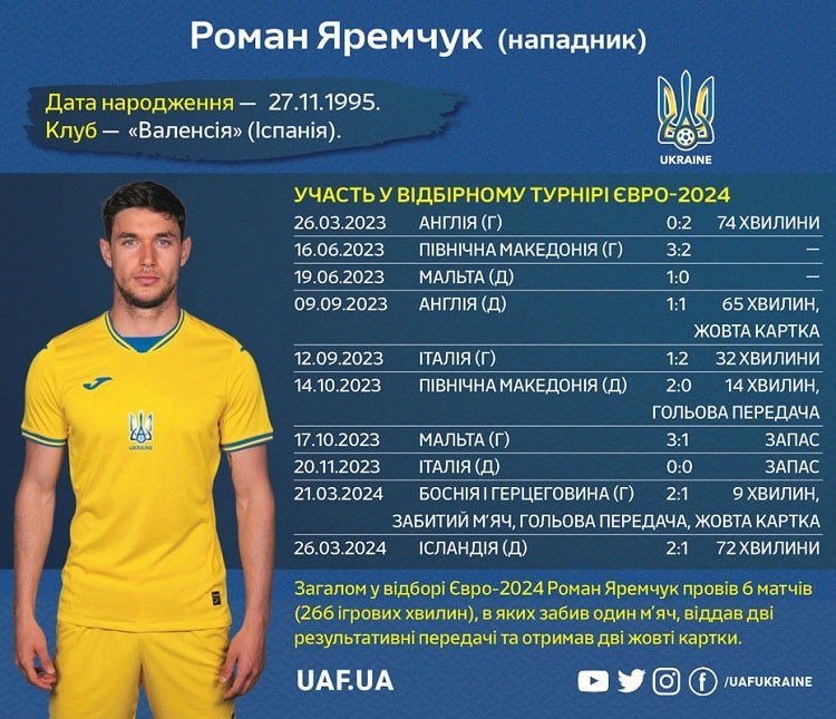 Євро-2024. Кадри збірної України у відбірному турнірі: Роман Яремчук