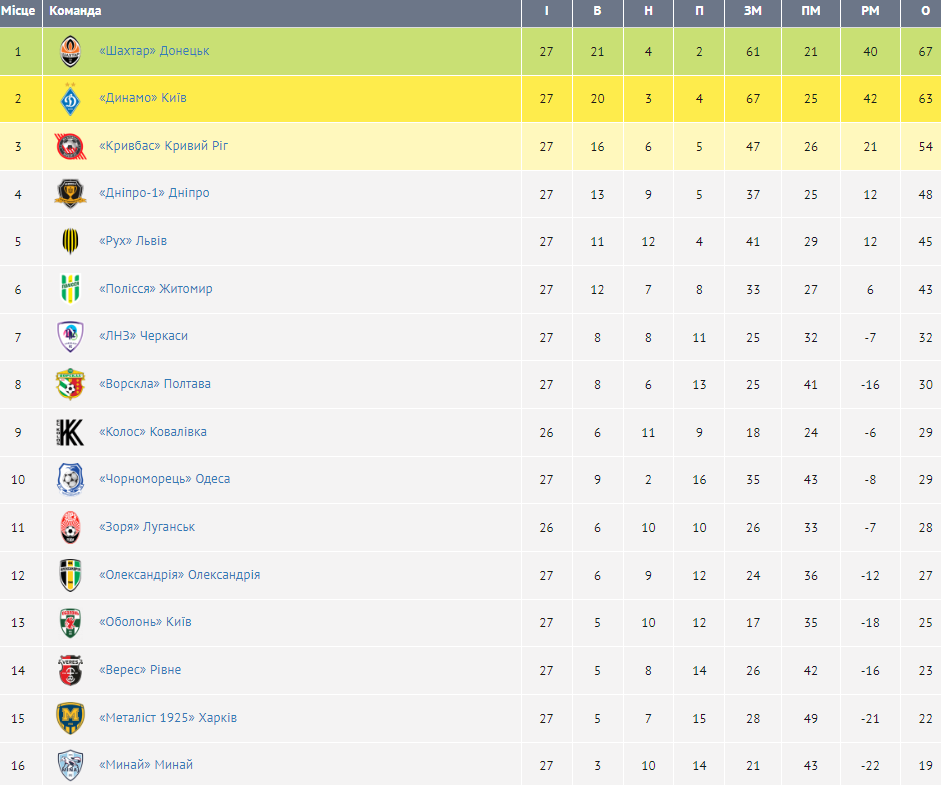 Турнірна таблиця УПЛ після 27-го туру: становище "Динамо" незмінне