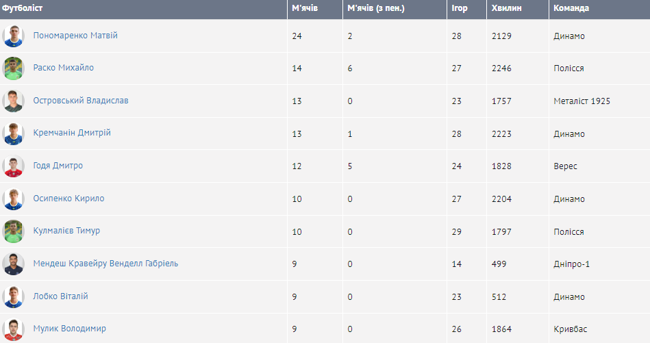 Нападник "Динамо" U-19 Матвій Пономаренко, який забив 24 голи цього сезону, став найкращим бомбардиром цього сезону.