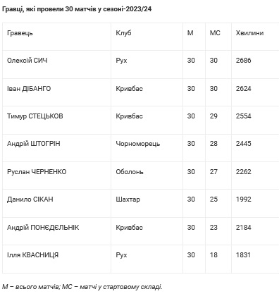 У сезоні-2023/24 виступали 490 футболістів. І лише вісім із них взяли участь у всіх 30 матчах чемпіонату. Найбільше часу провели на полі 23-річний захисник «Руху» Олексій Сич – 2686 хвилин та його колега по амплуа з «Кривбасу» 22-річний камерунець Іван Дібанго – 2624.