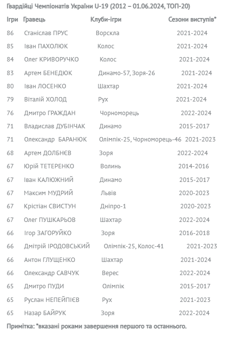 Починаючи з 2012 року, за весь час проведення чемпіонатів України серед гравців віком до 19 років, у цих змаганнях було задіяно вже 3383 футболіста з 35-ти клубів. Перед початком чемпіонату-2023/2024 очолювали список гвардійців-юнаків Владислав Дубінчак з «Динамо та Олександр Баранюк з «Чорноморця» - по 71 грі. Проте за підсумками минулого юнацького чемпіонату одразу 7 (!) гравців, зуміли покращити цей всеукраїнський рекорд. В результаті список гравців з найбільшою кількістю ігор в чемпіонатах України U-19 очолив Станіслав Прус з «Ворскли» - 86 ігор.