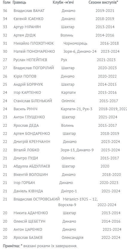 Починаючи з 2012 року, за час проведення усіх 12-ти Чемпіонатів юнацьких команд України (U-19: вік гравців до 19-ти років), у цих змаганнях було забито вже 7139 голів. І лідерство у списку найкращих голеадорів-юнаків займає Владислав Ванат, який у складі «Динамо» забив 36 (!) голів. У минулому ж юнацькому сезоні виділимо кращого бомбардира юнацького Чемпіонату Матвія Пономаренка з «Динамо», який збільшив лік своїх голів до 30-ти і займає наразі 6-е місце у списку найкращих бомбардирів за всю історію Чемпіонатів юнацьких команд. Виділимо також юнаків, які в ході минулого Чемпіонату U-19 подолали рубіж у 20 голів - Антона Глущенка («Шахтар»), Дмитрія Кремчаніна, Віталія Лобка, Антона Царенка (усі – «Динамо»), Владислава Островського («Ворскла»), Даніеля Ківінду («Дніпро-1») та Ярослава Базаєва («Олександрія»).